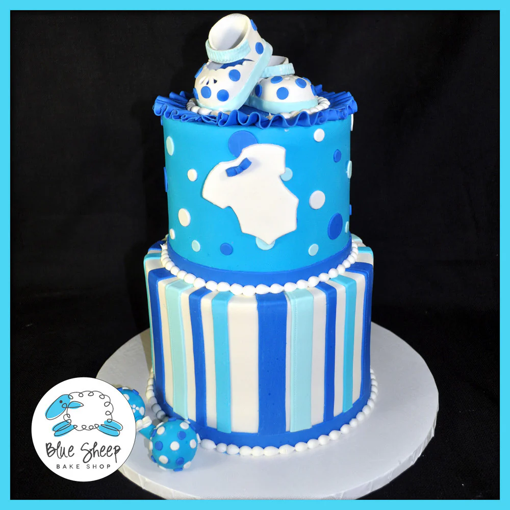 This adorable two tiered baby shower cake features stripes, polka dots, fondant booties & onesie. We delivered this adorable shower cake to Prince Albert's Palace in Fords, NJ.