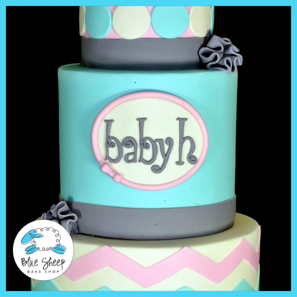 Three tiered chevron inspired baby shower cake in pink, white, blue, and grey. The pictured cake is a 4, 6, 8" tiered round cake and features a chevron pattern, adorable baby tag, geometric pattern, and grey bow cake topper.