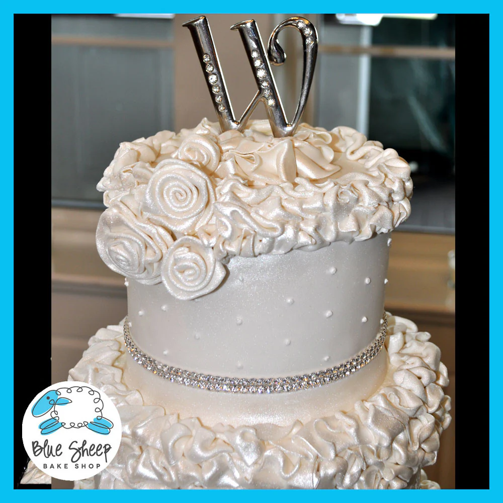 This gorgeous four tier wedding cake features scroll stenciling, fondant ruffles, ribbon roses, swiss dots, and crystal banding.